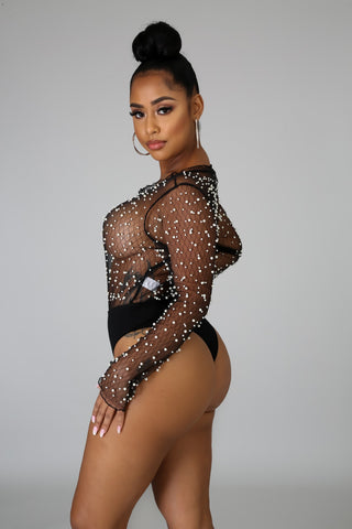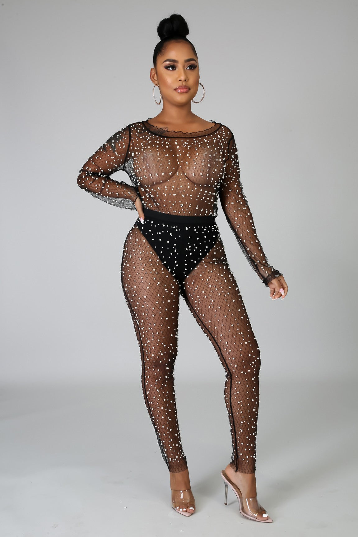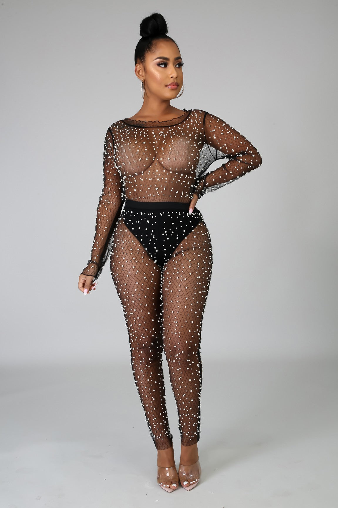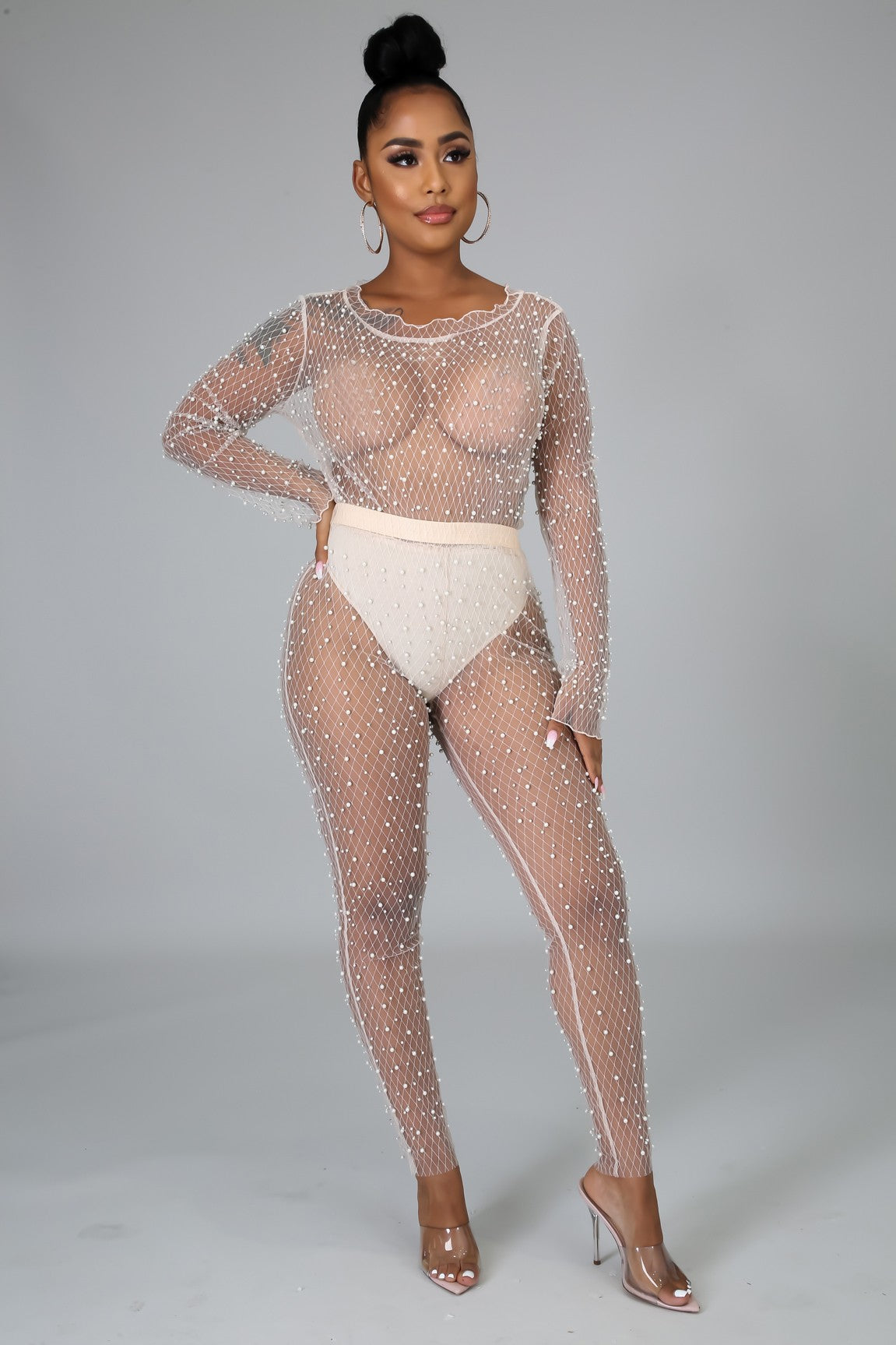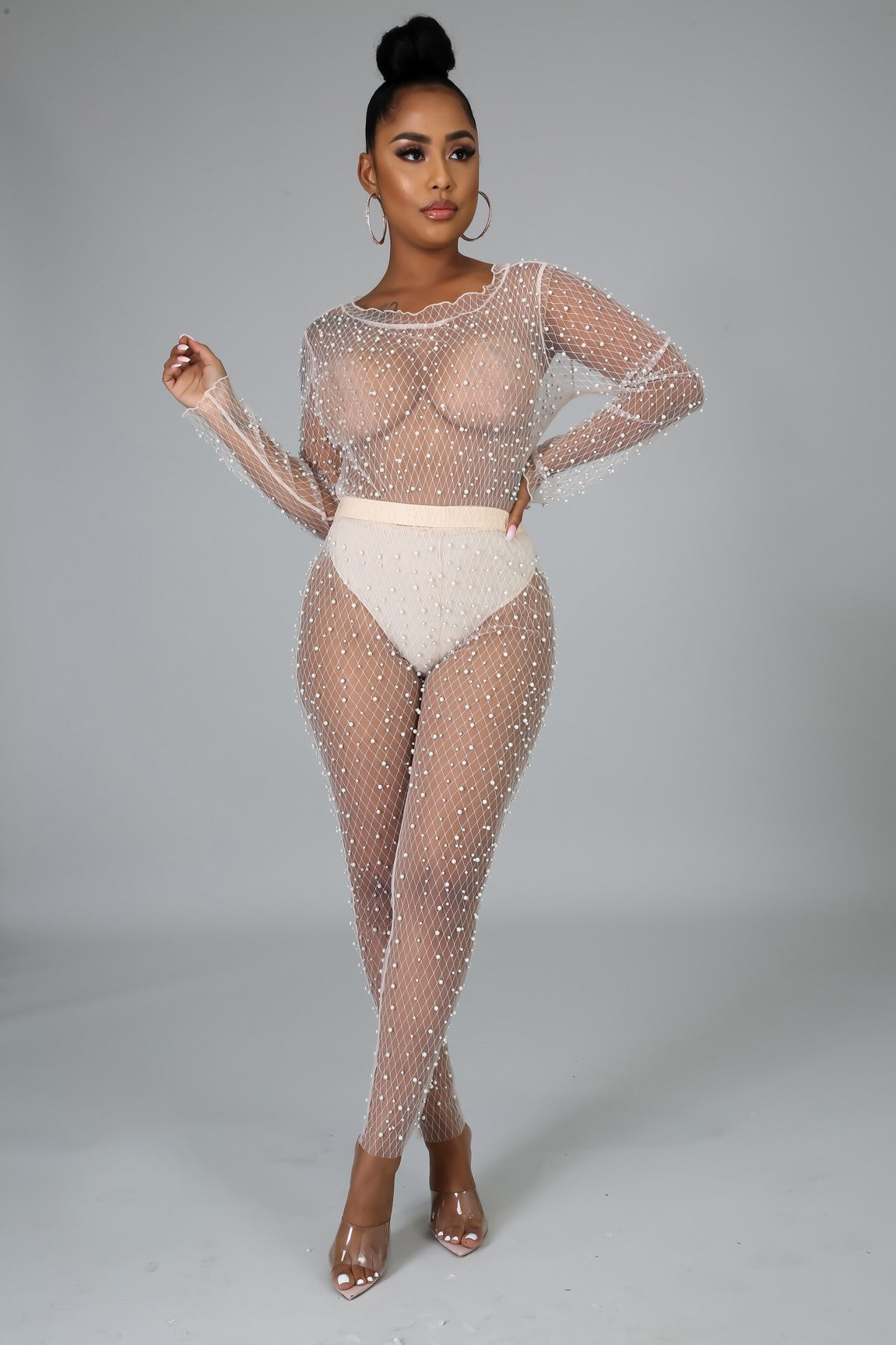 This pearl sheer bodysuit features a stretchy fabric, scallop neckline, long sleeves, sheer pearl detail throughout, finished with a snap button at crotch closure, high waist sheer pants and no closure.